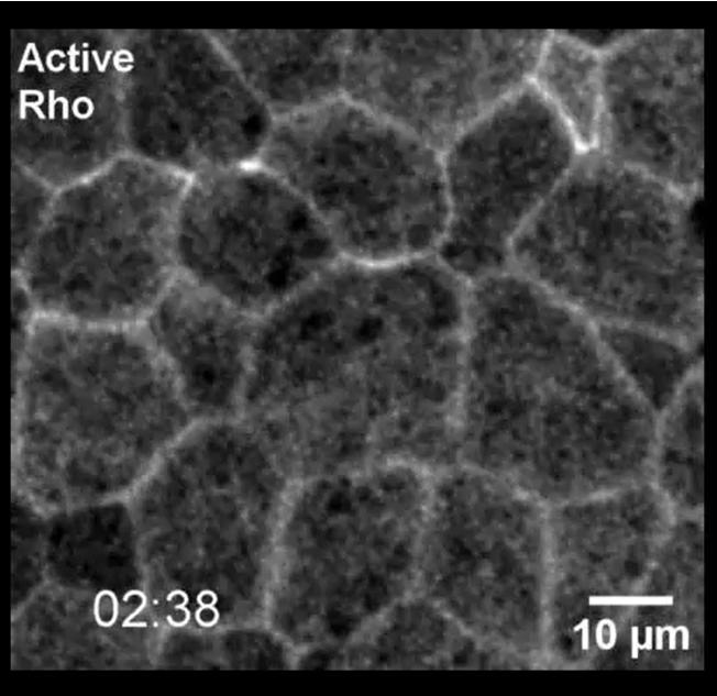 optogenetic activation of Rho-mediated actomyosin contractility. B) Left: Plot of active Rho
