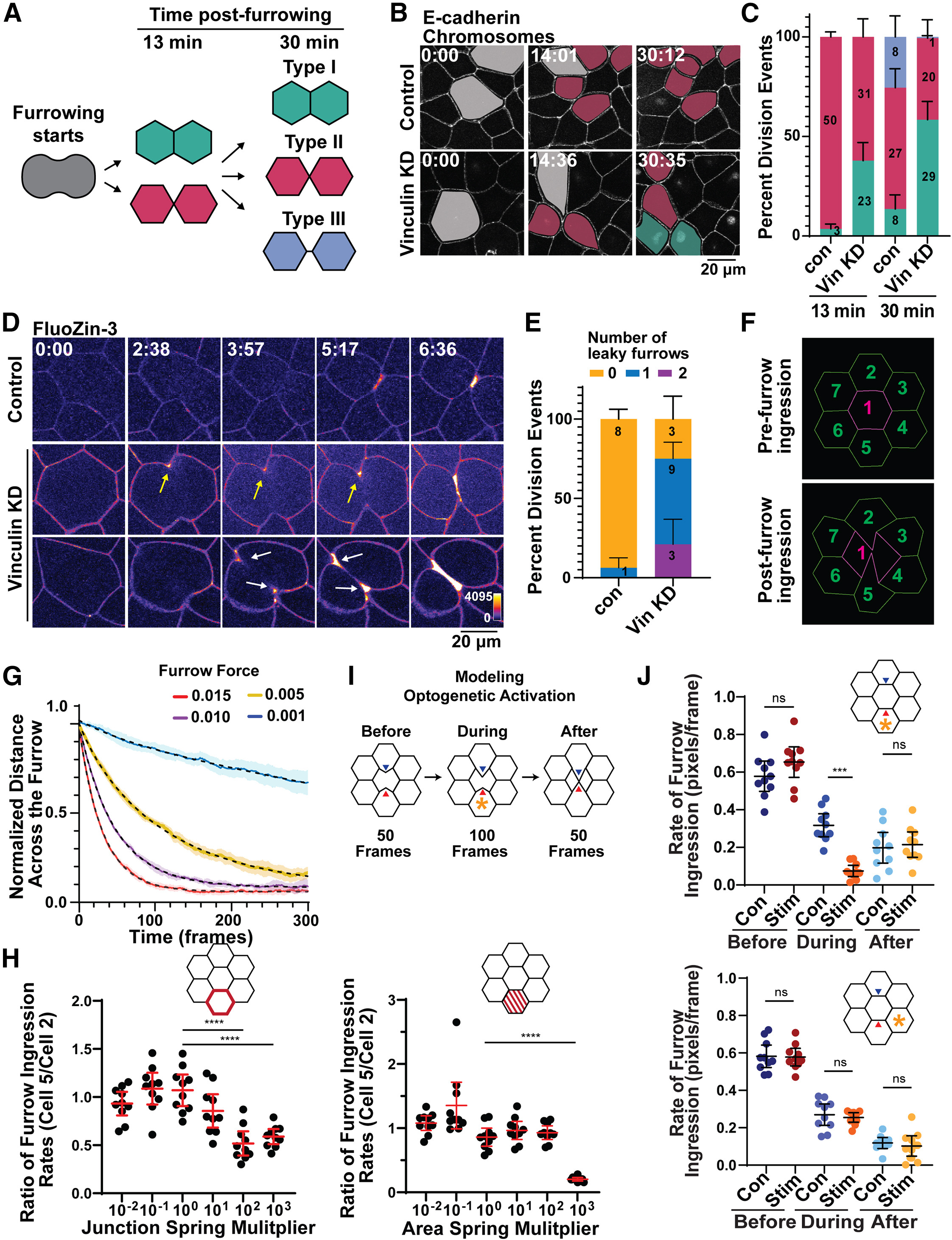 (E) Quantification of leaky furrows in control and vinculin KD embryos. Mean ± SEM. n = number of divisions in each category. 2 experiments; controls = 4 embryos; vinculin KD = 4 embryos.