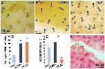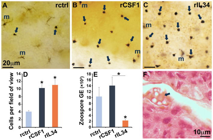 Figure 1. Enrichment of cutaneous CSF1- and IL34-Mϕs and Bd challenge. Non-specific esterase (NSE) stain of epidermal skin layers from the (A) rctrl- and (B) rCSF1- and (C) rIL34-administered frogs. Arrows indicate myeloid (Mϕs) cells, and melanocytes are denoted by ‘m’. Images are representative of 4 animals per treatment group (N = 4). (D) Means ± SEMs of the number of NSE-positive cells per field of view of skin from frogs 3 days after subcutaneous administration of the rctrl or rCSF1 or rIL34 (N = 4 frogs/treatment group). (E) Bd loads (zoospore genomic equivalents, GE) in dorsal skins of frogs 3 days after control (rctrl)-, CSF1-, and IL34-Mϕ-enrichment followed by 7 days of Bd challenge (N = 7 frogs/treatment group). (F) H&E stain of Bd (arrow)-infected skin. Asterisks above bars indicate statistical significance from the rctrl groups, and asterisks above lines are indicative of statistical differences between the treatment groups denoted by the lines, p < 0.05.