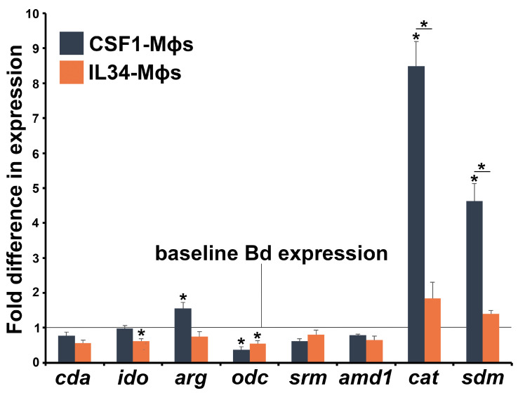 Figure 4. Consequences of Mϕ-Bd coculture on Bd gene expression. Developing Bd thalli were incubated alone or in coculture with CSF1- and IL34-Mϕs for 5 h (5 Bd/Mϕ), and Bd was examined for expression of immune evasion genes relative to the Bd gapdh endogenous control. All data are represented relative to baseline Bd gene expression, depicted by the horizontal line. The results are means ± SEMs of Bd gene expression from 6 independent CSF1- and IL34-Mϕ cocultures, with frog cells derived from 6 individual frogs, N = 6. Asterisks above bars indicate statistical significance between baseline and Mϕ-elicited Bd gene expression, and asterisks above lines are indicative of statistical differences between the treatment groups denoted by the lines, p < 0.05. The examined Bd genes included arg—arginase; amd—adenosylmethionine decarboxylase; cat—catalase; cda—chitin deacetylase; ido—indoleamine 2,3 dioxygenase; odc—ornithine decarboxylase; sdm—superoxide dismutase; and srm—spermidine synthase.