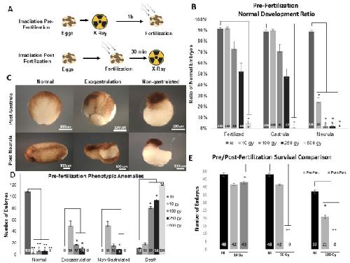 X-Ray Impact on Xenopus laevis development pre- and post- fertilization. (A) Two alternative experimental designs: irradiation pre- and post-fertilization. (B) Bar plot of the average normal development of eggs irradiated with 10, 100, 250, and 500 Gy pre-fertilization. P values: t-test, n=3, with 120 eggs per condition in triplicates from 3 different females (total 360 per condition). Conditions significantly decreased compared to control (*: two-tailed paired t-test P < 0.05). (C) Sample embryos illustrate the phenotype classes observed during X-ray exposure: normal, exogastrulation, non-gastrulation, and death. (D) Distribution of phenotypes observed in C for different pre-fertilization X-ray exposures. P values: t-test, n=3, with 120 eggs per condition in triplicates from 3 different females (total 360 per condition). Conditions significantly decreased compared to control (*: two-tailed paired t-test P < 0.05; **: t-test P < 0.001). Subfigures B and D show quantification from two independent experiments. (E) Average survival of late neurula embryos from pre- and post-fertilized irradiated groups at 10, 50, and 100 Gy. Each group started with 50 initial eggs or zygotes in triplicates per condition of two independent females (300 embryos per condition tested). P values: t-test, n=2 of 150 embryos per condition. Conditions significantly decreased compared to control (*: two-tailed paired t-test P < 0.05; **: t-test P < 0.001).