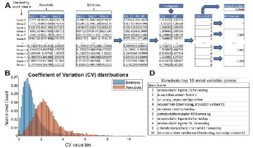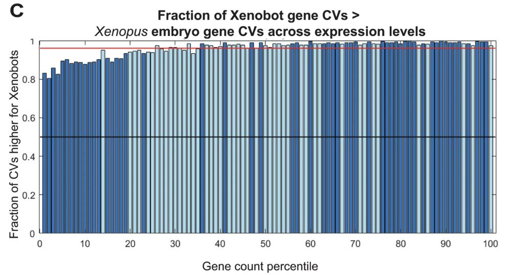 Fig. 2: Inter-individual variation in gene counts is greater in Xenobots than in age-matched Xenopus embryos for most genes.A Schematic of the analysis method. All genes were ranked by their mean count value across all 6 data pools, after which the standard deviations of the gene counts amongst individual Xenobots and individual age-matched Xenopus embryos were estimated (Est. σX and Est. σE) and used to calculate the coefficients of variation (CVs) for each (CVX and CVE). B Histograms of the normalized distributions of CVs for Xenobots and age-matched embryos genes. Xenobots have significantly higher CVs and wider CVs distribution than age-matched embryos (Wilcoxon rank sum test, p = 0). Where the CVE distribution had a mean of 1.2537 and standard deviation of 0.9716, and the CVX distribution had a mean of 2.6115 and standard deviation of 1.3609. C Comparison of gene expression variation between Xenobots and age-matched embryos across expression levels. The genes for which CVX > CVE were noted, and of all the included genes, 96.06% had greater CVX than CVE. The gene list was then divided into 100 equal-size bins (percentiles), and the fraction of each bin for which CVX > CVE was plotted. Each bar represents one bin of genes ranked from lowest to highest gene counts, and its height indicates the fraction of genes in the bin for which CVX > CVE. The black line marks 0.5. For all bins, most genes in the bin had a greater CV for Xenobots than age-matched Xenopus embryos. The red line shows the overall fraction of genes for which CVX > CVE (0.9606), and the dark blue bins were found to be significantly different from this value (p < 0.05), while light blue bins were not (p > 0.05) according to a permutation test, indicating that the trend of increasing bin value with increasing gene count was not due to chance. D Table showing top 10 most variable genes in Xenobots.