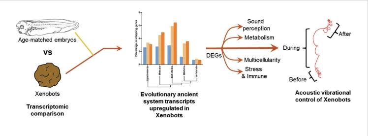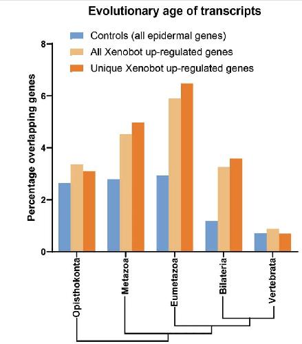 Fig. 5: Xenobot transcripts are enriched in evolutionary older strata compared to control transcripts.Control transcripts are all the Xenopus genes expressed in epidermal progenitor cells + multiciliate cells + alpha and beta ionocyes + goblet cells (3374). Phylostratigraphic analysis of controls transcripts, all Xenobot upregulated transcripts (1812), and transcripts uniquely upregulated in Xenobots (1450), showing Xenobot transcripts significantly more enriched in Bilateria, Eumetazoa, and Metazoa compared to controls and the unique Xenobot upregulated transcripts more enriched than all Xenobot upregulated transcripts in these evolutionarily older strata. Chi-square test, p < 0.001.