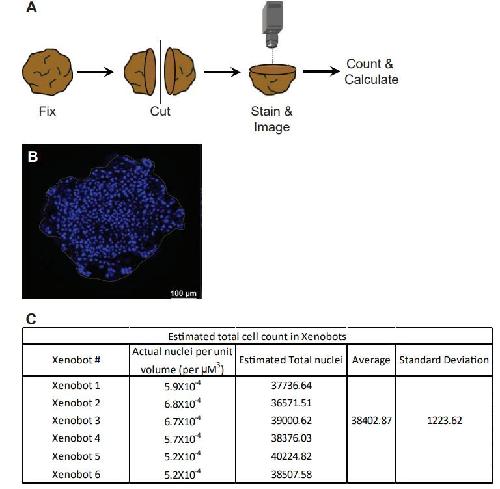 interior, counting and calculation to obtain total nuclei per Xenobot. (B) Representative image of