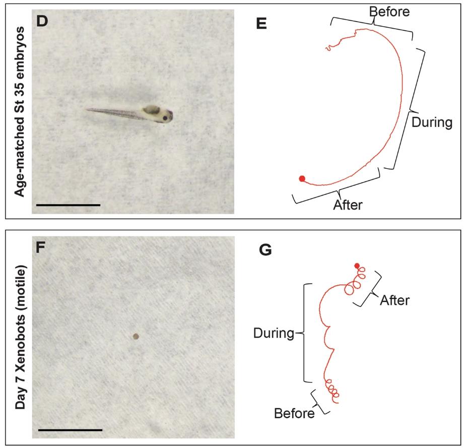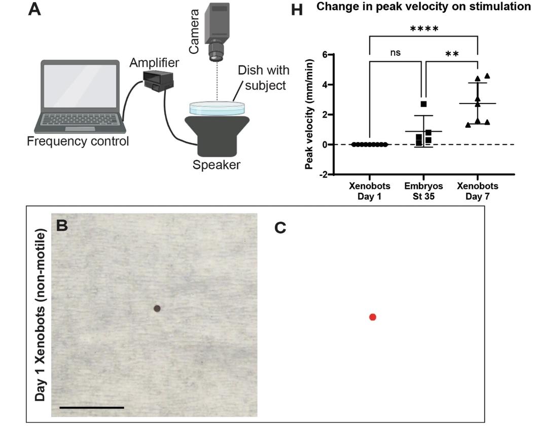 Fig. 4: Xenobots respond to acoustic vibrations by changing motion behavior.A Experimental setup for exposure of subjects to 300 Hz acoustic vibration and time lapse recording of motion behavior for 10 min before exposure, 10 min during exposure, and 10 min after exposure. Created with BioRender.com. B–H Time lapse recording of motion behavior of day 1 non-ciliated, non-motile Xenobots, age-matched stage 35 Xenopus embryos, and day 7 autonomously motile Xenobots, along with motion tracking of their behavior and quantification of change in peak velocity from baseline during interval of 300 Hz vibration stimulus. B, D, F Representative image of day 1 non-motile Xenobots, age-matched stage 35 Xenopus embryos treated with tricaine to inhibit muscle movement while leaving cilia-based motion intact, and day 7 autonomously motile Xenobots, respectively. Scale bar = 5 mm. C, E, G Representative tracking of day 1 non-motile Xenobots, age-matched stage 35 embryos, and day 7 autonomously motile Xenobots, respectively, across the time intervals of before, during, and after 300 Hz vibration stimulus. H Quantification of change in peak velocity (millimeters/min) between the time intervals of before and during 300 Hz vibration stimulus. Data represented as mean ± SD. Xenobot Day 1—n = 9, Embryos St 35—n = 5, Xenobots Day 7—n = 7, ns-non-significant, **p < 0.01, ****p < 0.0001, repeated measures One-Way ANOVA with Tukey’s multiple comparison test.
