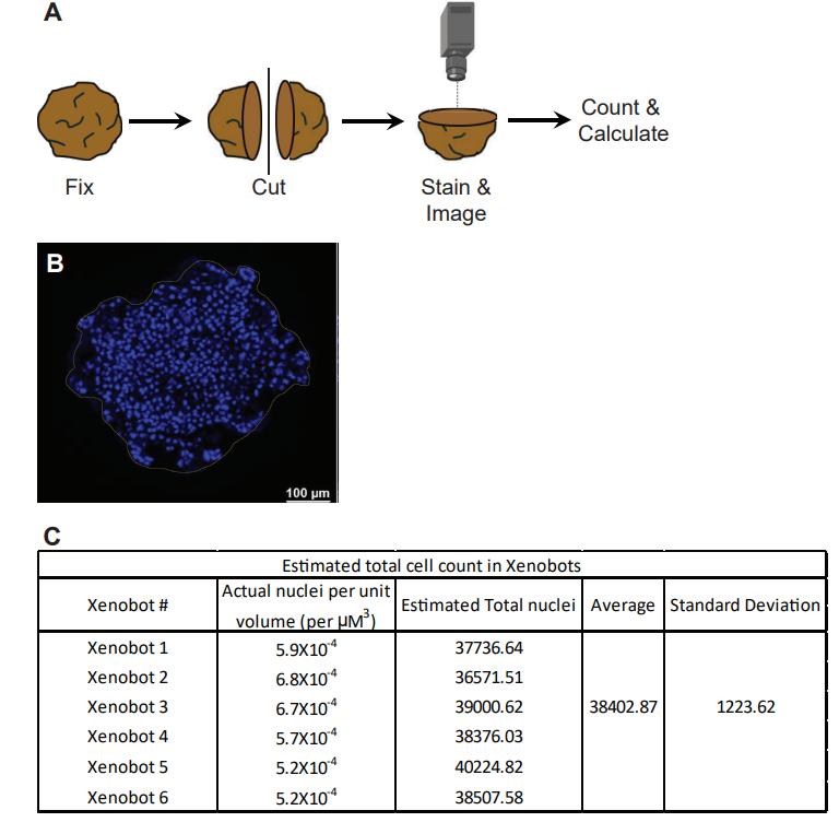 stained nuclei in the interior of Xenobot. (C) Table showing actual nuclei per unit volume imaged