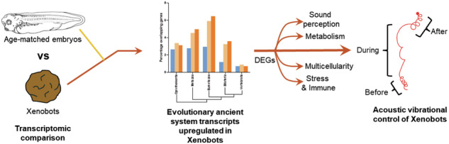 Fig. 1: Major transcriptional changes in Xenobots compared to age-matched stage 35/36 Xenopus embryos.A A live Xenobot and schematic of the experimental setup with three replicates for each Xenobot pool and age-matched stage 35/36 Xenopus embryo pool with each replicate having fifty and ten samples, respectively. Illustration from Nieuwkoop and Faber178 (B) Volcano plot for differential expression between Xenobots and age-matched stage 35/36 Xenopus embryos. Significantly changed genes are highlighted in red.