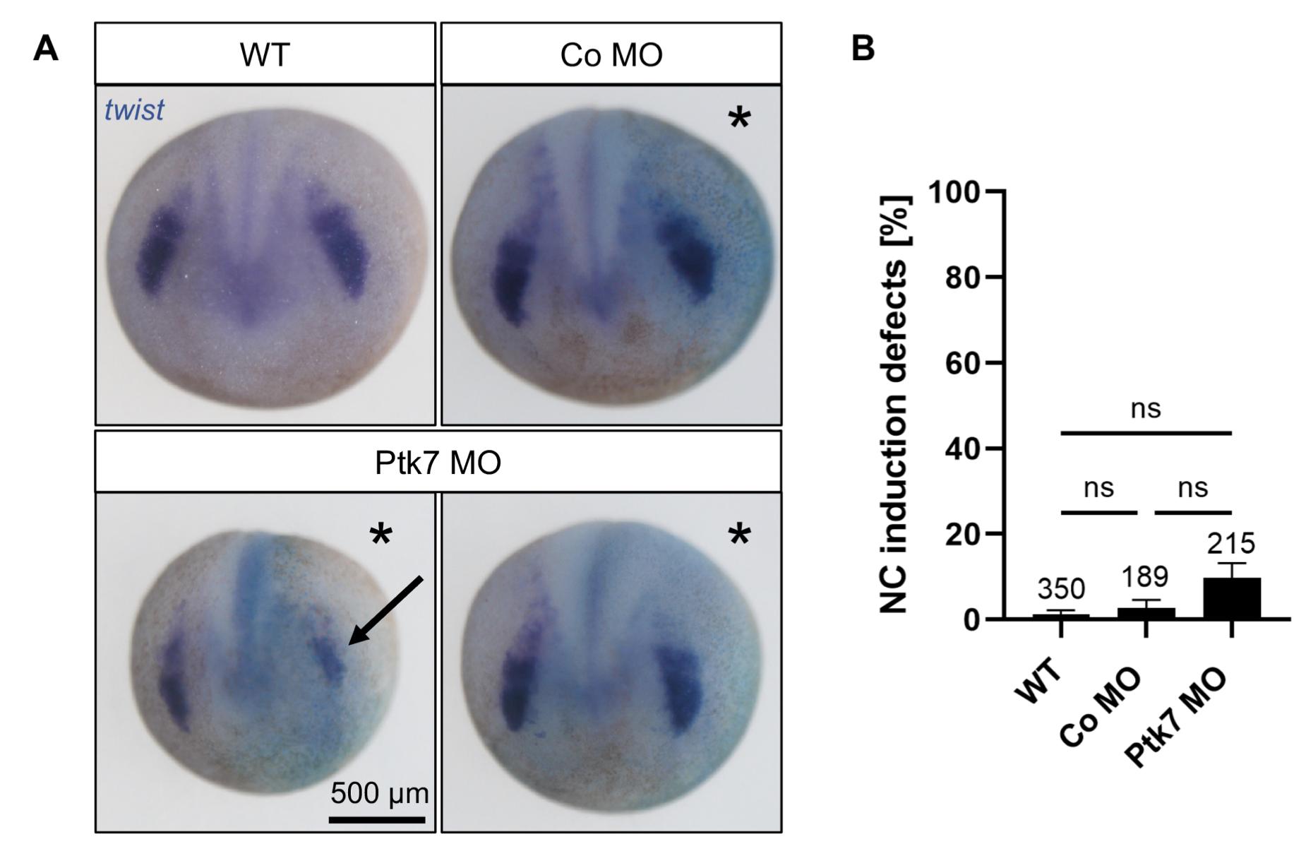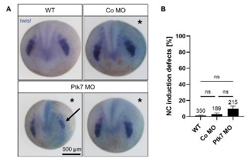 Fig. S1. Ptk7 loss-of-function does not affect NC induction. Two-cell stage embryos were injected with 7.5 ng Ptk7 MO or a control MO in combination with 75 pg lacZ RNA as lineage tracer. (A) NC cell induction was analyzed at stage 17/18 by twist in situ hybridization. Asterisks mark the injected side. Arrow indicates NC induction defect. Scale bar: 500 μm. (B) Graph showing NC induction defects of four independent experiments. The total number of embryos is indicated for each column. Data are mean ±s.e.m., ns = not significant (one- way ANOVA).