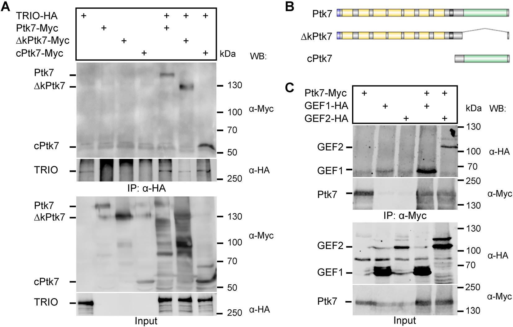 Fig. 2. TRIO interacts with Ptk7 in HEK293 cells. (A-C) HEK293 cells were transfected as indicated and immunoprecipitations were performed using anti-HA (A) or anti-Myc (C) antibodies. Ptk7 constructs used for immunoprecipitation are shown in B. (A,C) Co-immunoprecipitated proteins are shown in the upper panel, immunoprecipitated proteins in the middle panel and cell lysates in the bottom panel. Antibodies used for western blotting and molecular weights (kDa) are indicated on the right. Representative results of at least three independent experiments are shown.