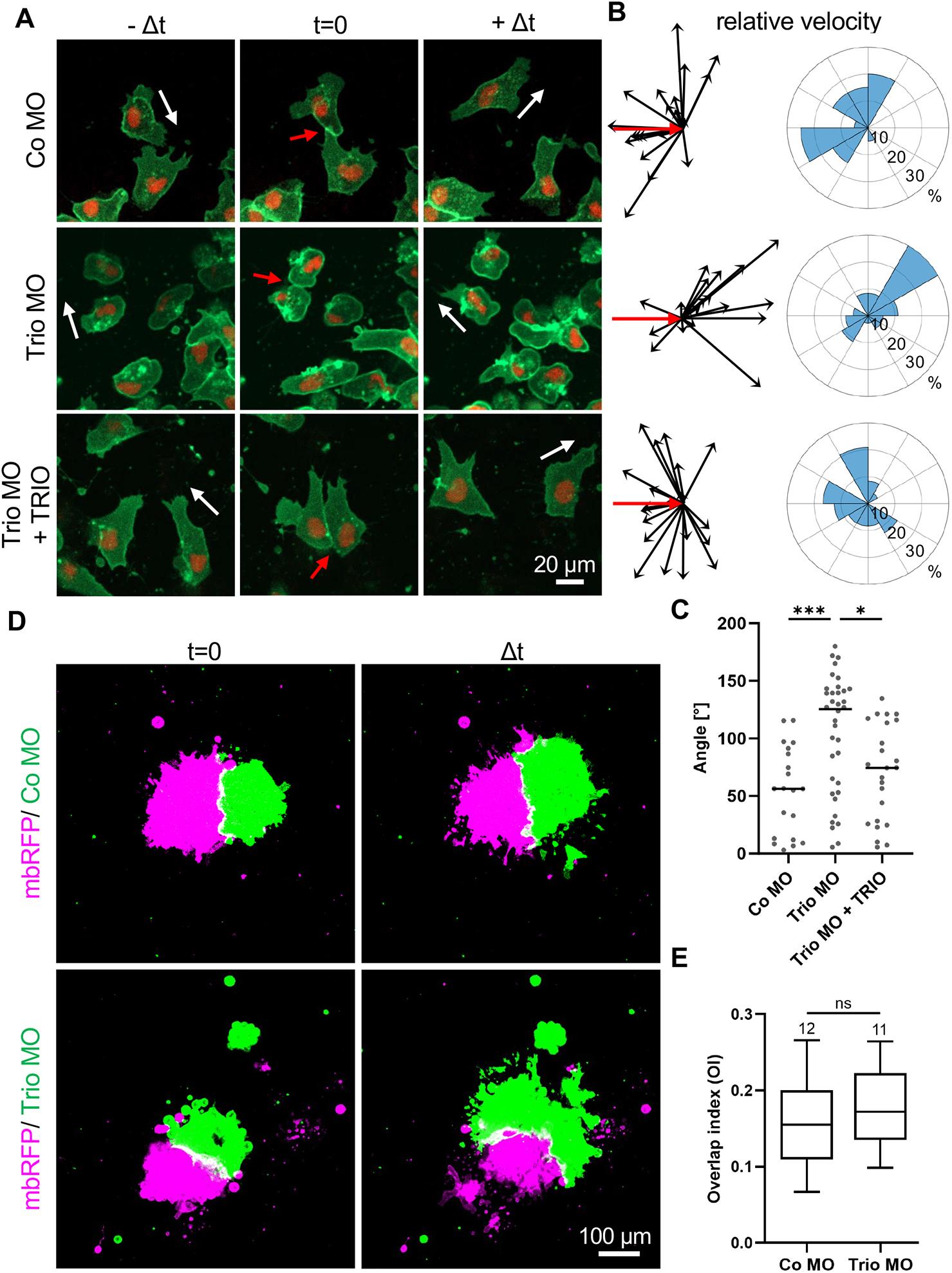 Fig. 4. Trio is required for contact inhibition of locomotion. (A-C) Embryos were injected with 5-6 ng Trio MO or control MO together with 100 pg mbGFP RNA and 200 pg H2B-mCherry in one blastomere at the two-cell stage. For rescue experiments, 150 pg TRIO DNA was co-injected. NC cells were explanted at stage 18 and imaged after 4 h of cultivation, when the NC cells had started to migrate as single cells. (A) Single NC cells before (−Δt), during (t=0) and after (+Δt) collision. Scale bar: 20 µm. White arrows indicate the direction of migration. Red arrows indicate cell-cell collisions. (B) Relative velocity vectors (black) with initial velocity vector (red) of 20 representative tracked NC cells are shown (left). Rose plots (right) showing the relative velocity vector distribution of all tracked NC cells. Number (n) of analyzed NC cells: Co MO=20, Trio MO=36, Trio MO+TRIO=24. (C) Graph presenting the angles between the velocity vectors and the initial vector. Velocity vectors below the initial vector have been horizontally flipped so that all angles are between 0° and 180° for comparison. *P<0.05, ***P<0.001 (Kruskal–Wallis test). (D,E) For confrontation assay, embryos were injected with either 100 pg mbRFP RNA alone or 50 pg mbGFP together with 4 ng MO in one blastomere at the eight-cell stage. Explanted NC cells were co-cultured and analyzed by time lapse microscopy. (D) Confronted explants at the start of the experiment (time point t=0, left). Confronted explants at the time point of maximum invasion (Δt, right). Scale bar: 100 µm. (E) Box plot showing the overlap index (OI) at the time point of maximal invasion (Δt) for three independent experiments. The number of analyzed confrontation events is indicated for each column. The box extends from the 25th to the 75th percentile, with whiskers indicating the maximum 1.5×IQR. The median is plotted as a line inside the box. ns, not significant (P>0.05; Mann–Whitney test).
