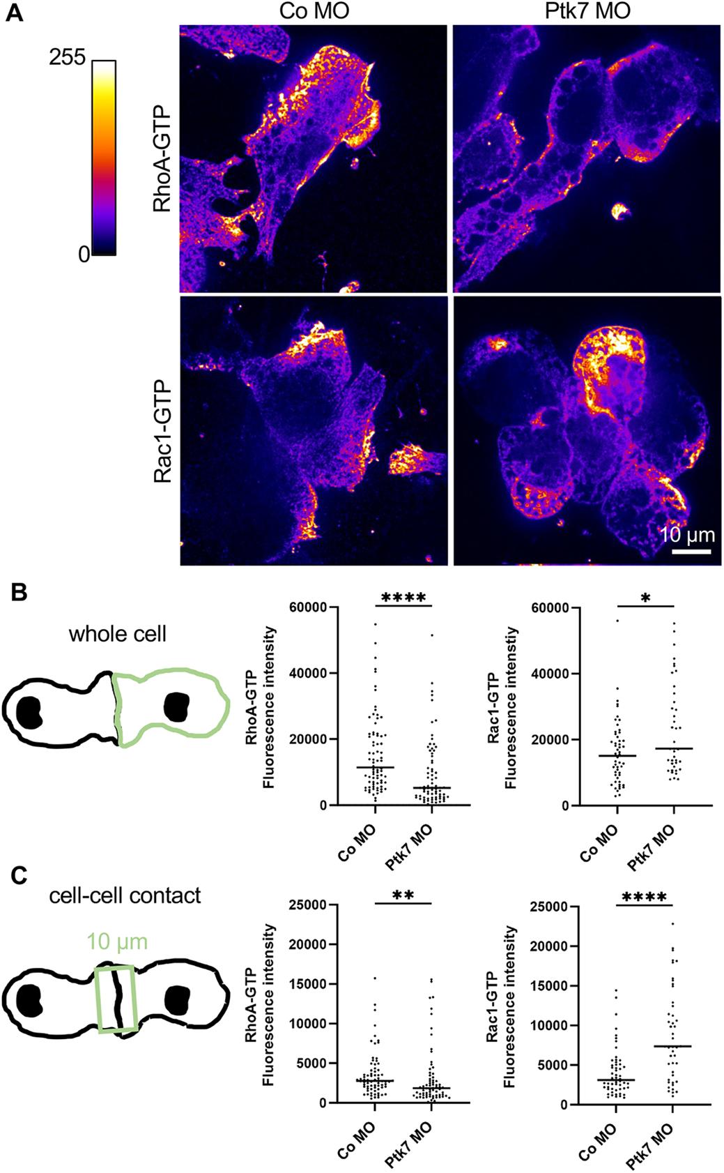 Fig. 6. Loss of Ptk7 function leads to downregulation of RhoA but upregulation of Rac1. (A) Embryos were injected with 7.5 ng Ptk7 MO or control MO, together with 100 pg mbGFP RNA as lineage tracer in one blastomere at the two-cell stage. NC cells were explanted at stage 18 and fixed after 2 h of cultivation. Antibody staining against RhoA-GTP or Rac1-GTP were performed. The ‘Fire’ lookup table of ImageJ was applied. Scale bar: 10 µm. (B) Quantification of the antibody signal of the whole cell. The CTCF is plotted in the graphs. Number (n) of analyzed NC cells of at least three independent experiments: RhoA-GTP: Co MO=77, Ptk7 MO=73; Rac1-GTP: Co MO=52, Ptk7 MO=40. *P<0.05, ****P<0.0001 (Mann–Whitney test). (C) Fluorescence intensity at NC cell-cell contact sides. A rectangle with a width of 10 µm was placed over the entire length of the contact (see schematic). Graphs plotting the CTCF of the signal inside the square. Number (n) of analyzed cell-cell contacts of at least three independent experiments: RhoA-GTP: Co MO=72, Ptk7 MO=70; Rac1-GTP: Co MO=54, Ptk7 MO=46. **P<0.01, ****P<0.0001 (Mann–Whitney test).