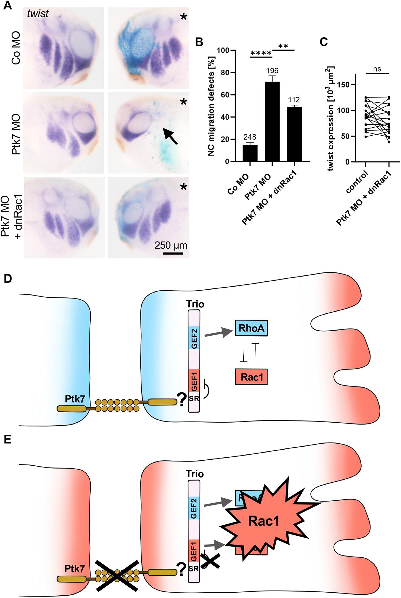 Fig. 7. dnRac1 restores NC migration in Ptk7 morphants. (A-C) Embryos were injected with 5 ng control MO or 5 ng Ptk7 MO in combination with 50 pg lacZ RNA as lineage tracer in one blastomere at the eight-cell stage. Co-injection of 10 pg dnRac1 DNA restored NC migration in Ptk7 morphants. (A) NC cell migration was analyzed at stage 26 by twist in situ hybridization. The injected side is marked with an asterisk. NC cell migration defects are indicated by an arrow. Scale bar: 250 µm. (B) Graph summarizing the percentage of embryos with NC migration defects from at least three independent experiments. The number of embryos is indicated for each column. Data are mean±s.e.m. ****P<0.0001, **P<0.01 (one-way ANOVA). (C) Graph showing the measured area of twist expression in the branchial arches of 20 randomly selected embryos of the rescue condition. The twist expression area of the uninjected side (control) is compared to the injected side of the embryo. ns, not significant (paired t-test). (D) At cell-cell contacts, Ptk7 interacts with Trio, thereby inhibiting its GEF1 activity. This is likely achieved by Ptk7 contributing to the autoinhibition of the GEF1 domain, which is mediated by the spectrin repeat domain (SR) of Trio. Thus, the activity of Trio is limited to activation of RhoA, thereby supporting contact inhibition of locomotion. (E) Conversely, loss of Ptk7 function releases this block on the GEF1 domain and leads to hyperactivation of Rac1. Models in D and E were generated using Procreate software.