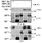 Fig. S3. The Trio GEF domains interact with Ptk7 in HEK293 cells. HEK293 cells were transfected as indicated and immunoprecipitations were performed using an anti-HA antibody. Co-immunoprecipitated proteins are shown in the upper panel, immunoprecipitated proteins in the middle panel and cell lysates in the bottom panel. Antibodies used for Western blotting and molecular weights (kDa) are indicated on the right. Representative results of at least three independent experiments are shown.