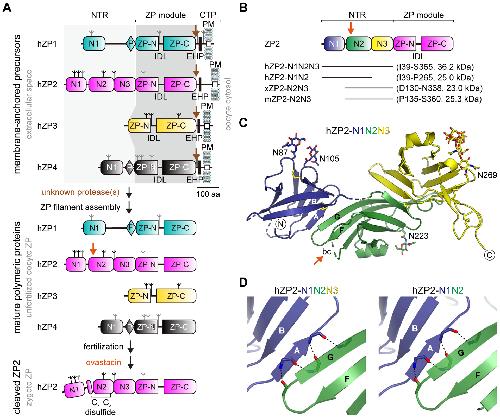 (A) Multidomain architecture of hZP filament components, in relation to their proteolytic processing during egg coat assembly and after fertilization. P, trefoil domain; PM, plasma membrane. White squares, transmembrane domains; inverted black and gray tripods, experimentally supported and predicted N-glycans; brown arrows, CFCS; orange arrow, ZP2 post-fertilization cleavage site.