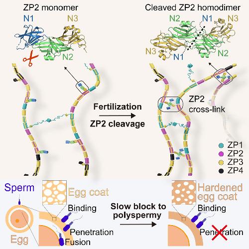 (D) Post-fertilization cleavage triggers the homodimerization of hZP2 NTRs that protrude from different filaments, non-covalently cross-linking the ZP into a tight mesh.
