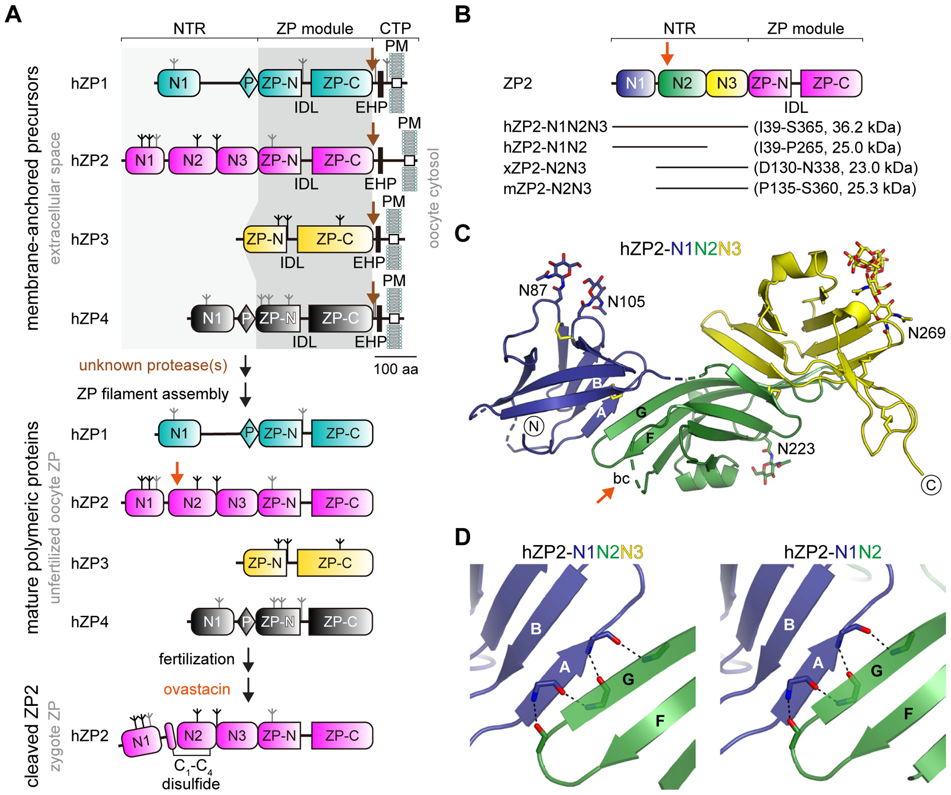 (C) Crystal structure of hZP2-N1N2N3. Disordered loops are represented by dashed lines, with the ZP2-N2 bc loop targeted by ovastacin indicated by an orange arrow.