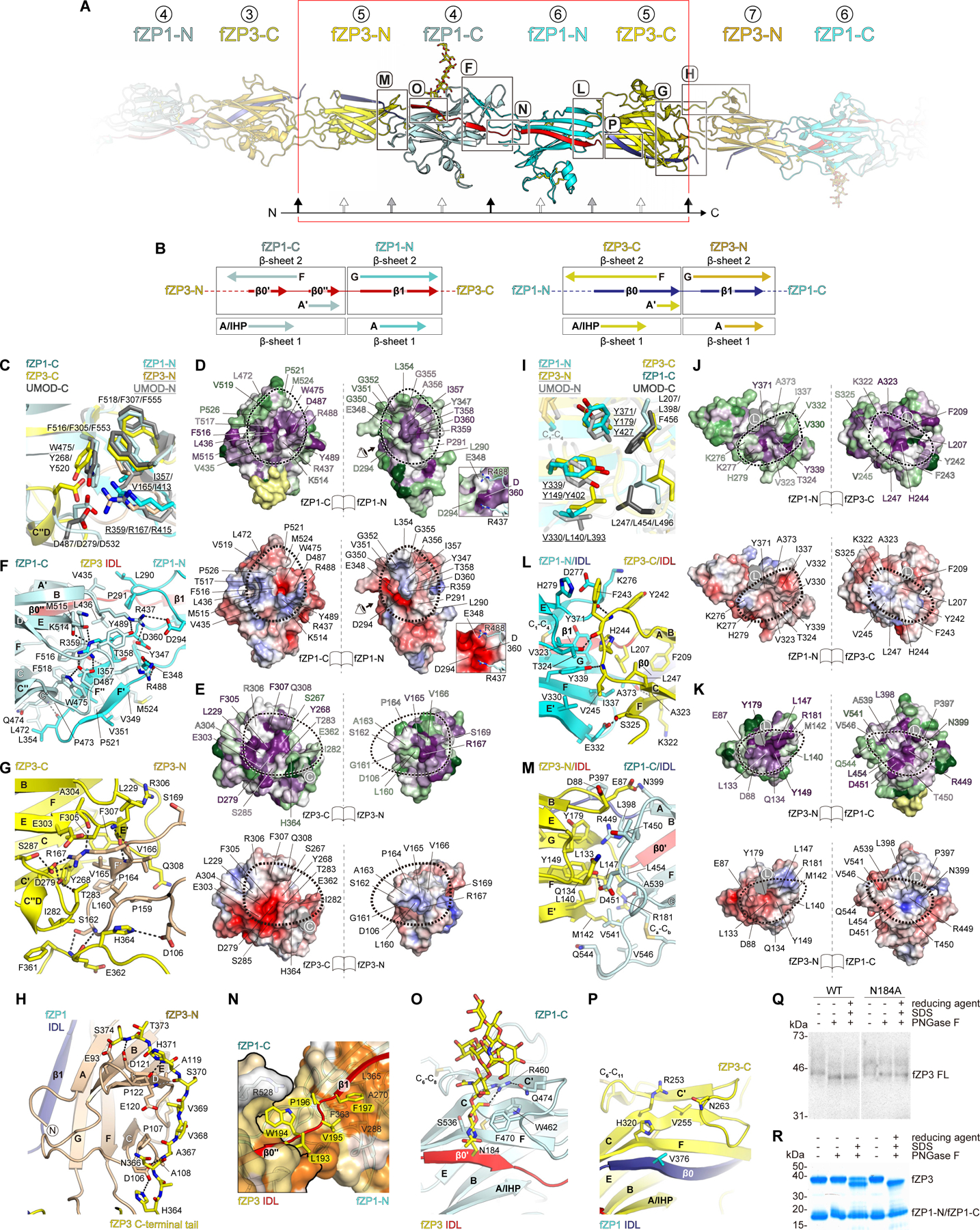 (L, M) fZP1-N/fZP3-C (L) and fZP3-N/fZP1-C (M) heteromeric interface contacts.