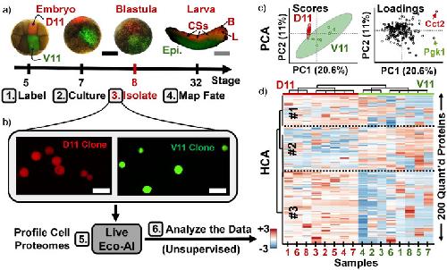 Figure 5. Proteome profiling of single cells undergoing differentiation in Xenopus laevis embryos. a) Dorsal‐animal (D11) and ventral‐animal (V11) blastomeres (n = 8) were microinjected with red and green fluorescent dyes at the 16‐cell stage; these lineages give rise to neural (central somites, CSs) and epidermal (Epi.) tissues in the larva, respectively. b) Descendant cells (∼50–75 µm) were isolated at the blastula stage using a micropipette under fluorescence guidance. ∼500 pg of proteome digest (∼2% of total cellular protein) was analyzed using the Real‐Time electrophoresis‐correlative AI workflow. c) Principal component analysis (PCA) of the cell proteomes revealed systematic differences among sample types (scores and loadings plots), driven by varying protein expression levels. Representative proteins are labeled. d) Hierarchical cluster analysis (HCA, z‐score scale) of the top 200 proteins grouped them into three major abundance profiles (#1–3), supporting cell‐type‐specific proteome remodeling. Scale bars: 500 µm (black), 2 mm (gray), 100 µm (white).