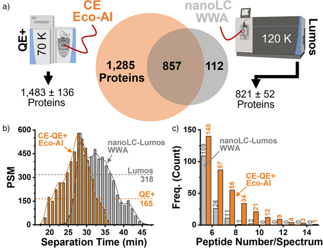 Figure 4. Benchmarking Real‐Time electrophoresis‐correlative (Eco) acquisition with AI‐aided processing against a modern nanoLC–tribrid–WWA workflow. A 1 ng HeLa digest was analyzed by capillary electrophoresis (CE) on a legacy Orbitrap mass spectrometer (Q Exactive Plus, QE+), and compared to nanoLC–MS on a tribrid Orbitrap (Fusion Lumos, Thermo) with higher ion transmission, faster scan rate (maximum 15 versus 13 Hz), and greater resolution (tested: QE+ at 70 000 FWHM and Fusion Lumos at 120 000 FWHM). a) Despite lower hardware specifications, Real‐Time Eco–AI yielded a marked sensitivity gain, validated also against independently obtained data (see Supporting Information). b) Peptide spectral match (PSM) rates reached levels comparable to the modern tribrid system. c) This gain resulted from richer tandem MS spectra acquired with Real‐Time Eco–AI compared to nanoLC‐WWA.