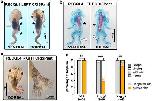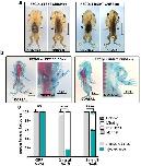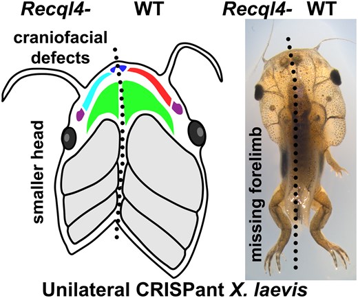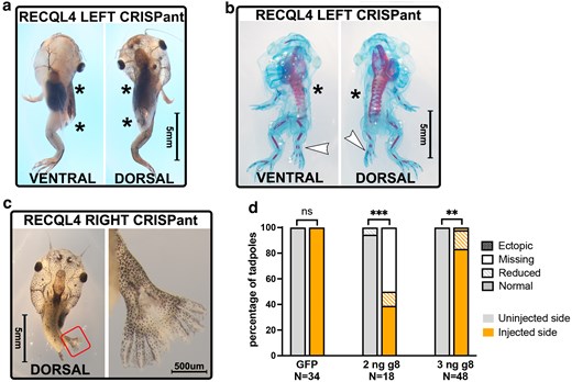 Fig. 4.Hindlimbs are more resistant to loss of Recql4 than forelimbs. a) Example of NF 58 stage tadpole where CRISPR knockdown of recql4 on the left side has led to failure of the left hindlimb to develop as well as the forelimbs. Missing limbs are indicated by an asterisk. b) Skeletal preparation of NF58 tadpole showing example of a smaller hindlimb on the recql4-edited left side (white arrowhead). Bone and cartilage staining show that this limb is not missing any elements. This individual is also missing the left forelimb as indicated with an asterisk. c) A single example of an ectopic hindlimb found in the study is shown. This tadpole is stage NF55 and editing is on the right. Two limbs appear as a mirror image duplication (preaxial polydactyly) on the right side and a single limb (partially obscured by the tail) on the left. Both forelimbs are present but cannot be seen due to the prehatching stage. d) Stacked bar graph showing observed frequency of hindlimb phenotypes on the injected vs uninjected side of half-CRISPant tadpoles. Fisher's exact tests, ns = nonsignificant, *** = P < 0.001, **P < 0.01. Count data is in Supplementary Table 7 in Supplementary File 1.