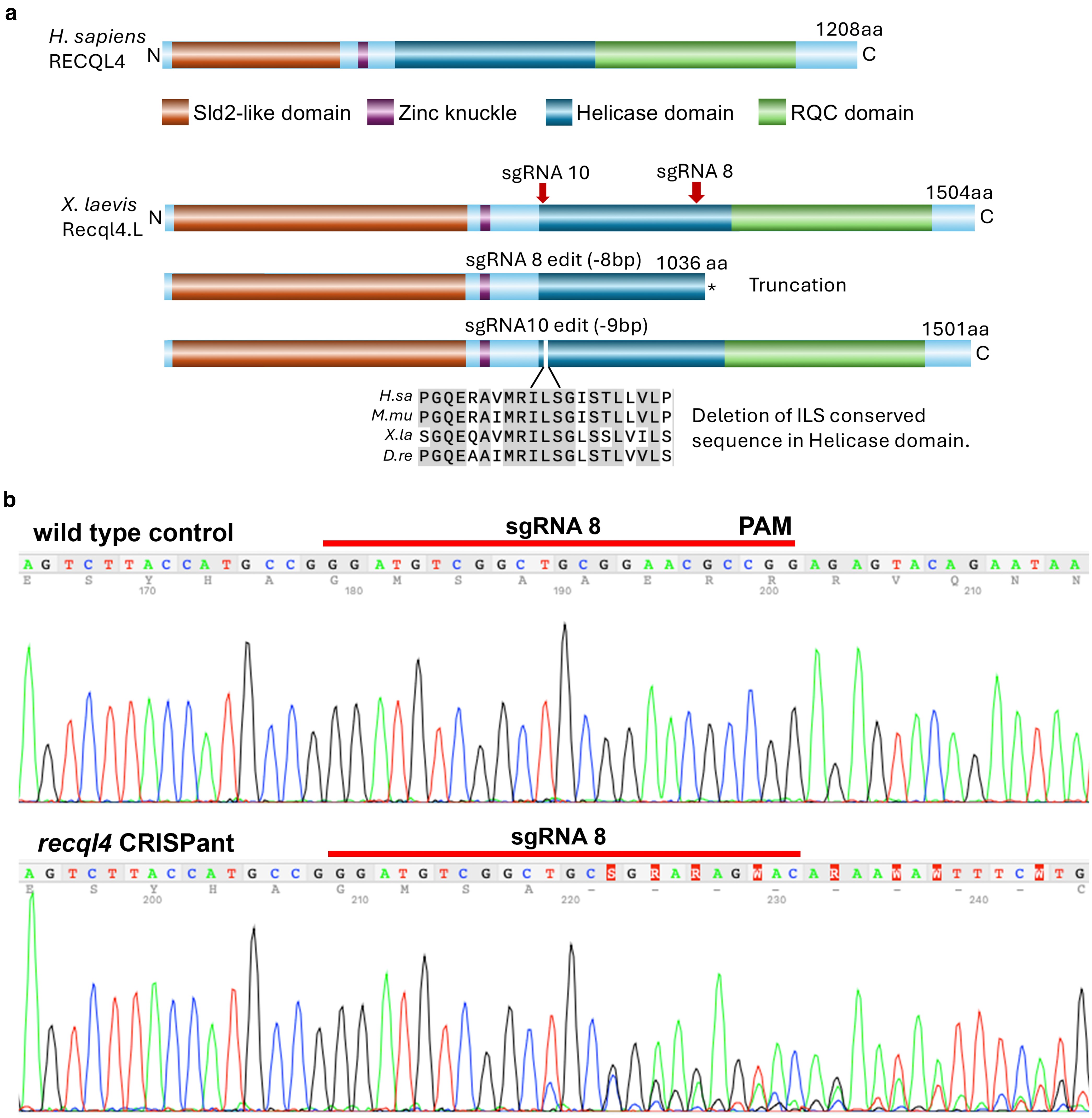 Fig. 1.Schematic of Homo sapiens (H. sapiens) and X. laevis RECQL4 proteins and CRISPR sgRNAs. a) Protein domain structure for human RECQL4 and X. laevis Recql4; down arrows indicate sgRNA target positions. Asterisk indicates premature stop codon. sgRNA 8 generates predominantly 8-bp deletions that will introduce a downstream stop codon in the helicase domain, resulting in a truncated protein. sgRNA 10 generates a dominant 9-bp deletion that removes bases “I,L and S” in a conserved region of the helicase. Protein alignments are shown for human, mouse, Xenopus, and zebrafish with shading highlighting conserved residues. b) Example of sgRNA8 editing, Sanger sequence traces from control wild type, and sgRNA8 CRISPant. Guide sequence is indicated by line on top of the Sanger trace.