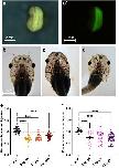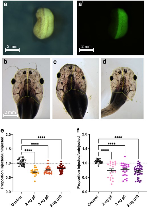 Fig. 2.Unilateral knockdown of recql4 results in smaller head and eye size on the edited side. a) Example of bright field and a′) fluorescence view of neurula embryo, dorsal view, and anterior uppermost. The embryo was injected on the right side at the 2-cell stage, and GFP can be seen only on the right side of the midline. b to d) Examples of tadpoles at 3 wk; outlines show the regions of interest (ROIs) used to measure area of the head and eye on the left and right sides using Fiji. Scale bar in b) applies to all panels. b) Control, injected with GFP mRNA only on the left side. c) Tadpole from the group injected with 2-ng recql4 sgRNA 8 (g8) and nGFP mRNA on the right and d) on the left. e and f) Scatter plots showing the proportions injected vs uninjected head side e) or eye f) area. Line indicates mean ± SEM. Dotted line denotes no difference between the 2 sides. Recql4-injected groups are compared to the control (only injected with GFP mRNA) using Kruskal–Wallis tests with Dunn's post hoc comparisons. Sample sizes are GFP-only controls: N = 28, 2-ng g8; N = 21, 3-ng g8; N = 24, 2-ng g10; and N = 39. Significantly different groups are indicated as ****P < 0.0001. Raw data can be found in Supplementary Tables 1 to 6 in Supplementary File 1.