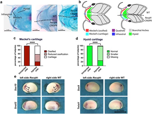 Fig. 5.Recql4 unilateral CRISPants have craniofacial defects on the edited side, but this does not arise from altered migration of cranial neural crest cells. a) Tadpole stage NF58 skeletal preparations, showing a ventral view of the jaw with the cartilage stained blue and the ossified bone stained red. The left image shows a control tadpole, the center shows a tadpole where recql4 was knocked down on the left side (no ossification of Meckel's cartilage on the injected side), and the right shows a tadpole with recql4 knockdown on the right side (reduced ossification of Meckel's on the injected side. b) Diagram of control and left-sided CRISPant tadpole ventral craniofacial structures to show the positions of the cartilages. c) Stacked bar graph comparing the frequency of the reduced or absent ossification of Meckel's cartilage on the uninjected vs injected side of unilateral recql4 CRISPants. N = 52, Fisher's exact test, ****P < 0.0001. d) Stacked bar graph comparing the frequency of smaller-sized hyoid cartilage on the uninjected vs injected unilateral CRISPants. N = 52, Fisher's exact test, ****P < 0.0001. e) In situ hybridization of early cranial neural crest markers in stage 19 unilateral recql4 CRISPants (left side edited). The cranial neural crest cells migrate from the dorsal neural tube in 3 streams, the mandibular (m), hyoid (h), and branchial (b). The scale bar in the bottom right panel relates to all panels. Further examples can be found in Supplementary Fig. 3.
