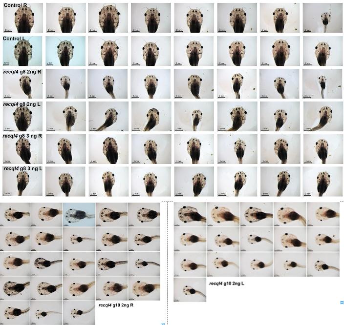 Supplementary Figure 1: Examples of recql4 CRISPR half tadpoles at 3 weeks of development (Figure 2E,F) Top: first tadpole batch, controls are injected with just GFP mRNA, CRISPants using sgRNA8, scale bars 2 mm. Dorsal view of head and trunk with anterior uppermost. Bottom second tadpole batch using sgRNA10, dorsal view of head and trunk with head to left, scale bars 1 mm. L, injected on Left side, R, injected on right side.