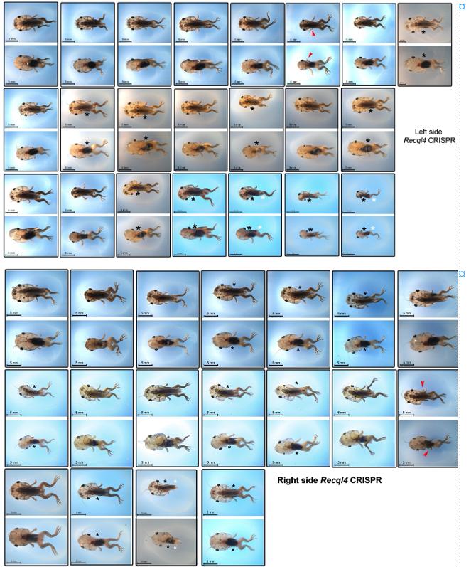 Supplementary Figure 2 Stage 58 half CRISPR recql4 sgRNA8 tadpoles (Figures 3, 4). Dorsal and ventral views for each animal are boxed, tails have been removed. Top, Left side CRISPants, Bottom, right side CRISPants, red arrowheads indicate ectopic limbs, black asterisk indicates a missing forelimb, white asterisk indicates a missing hindlimb. Scale bars 5 mm.