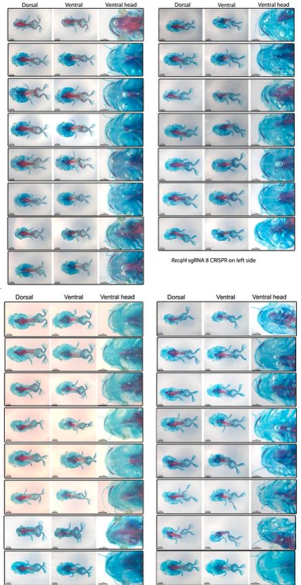 Supplementary Figure 3: Cartilage (blue) and bone (red) staining of half recql4 CRISPants (Figures 3, 4). Individual tadpoles are boxed, dorsal (left) and ventral (centre) showing whole stage 58 tadpole, right image is a zoom of the head cartilages from the ventral side. Top: left CRISPants, Bottom: right CRISPants.