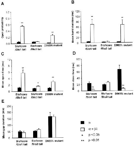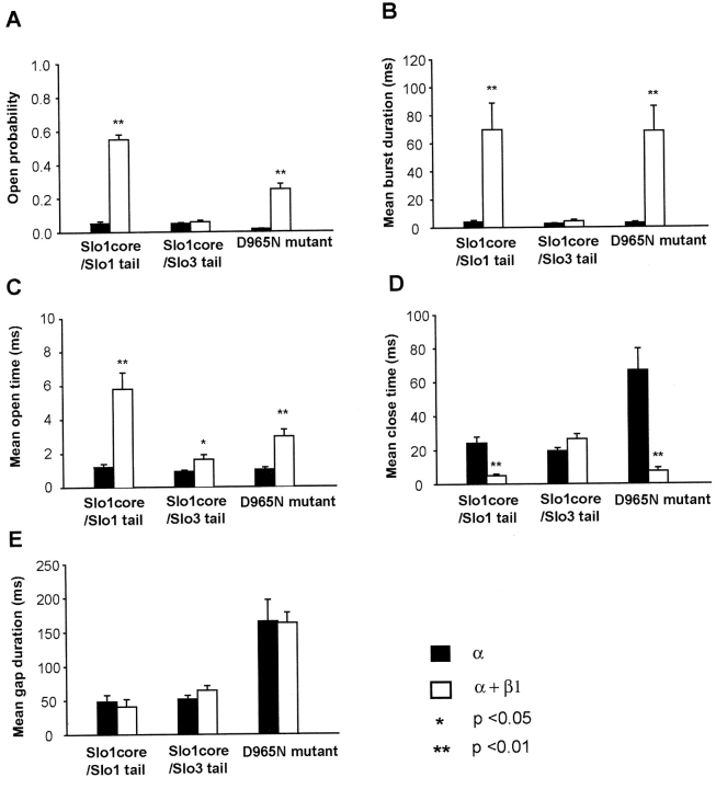 Figure 4. . Comparison of the single-channel kinetics for various channel constructs with and without β1 subunits. Slo1 core/Slo1 tail channels: 2.5 μM Ca2+i. Slo1 core/Slo3 tail channels: 0 μM Ca2+i. Slo1 with D965N mutation: 20 μM Ca2+i. Average of 5–9 patches in each case, except 3 patches for burst duration and gap duration of D965N.