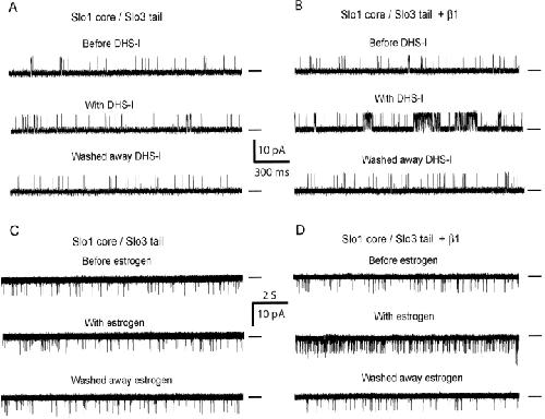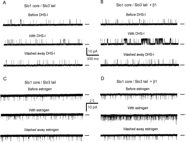 Figure 5. . DHS-I and estrogen activate Slo1 core/Slo3 tail channels only in the presence of the β1 subunit, indicating that the β1 subunit is functionally associated with Slo1 core/Slo3 tail channels. (A and B) Representative single-channel currents from Slo1core/Slo3 tail channels with and without β1 subunits and 100 nM intracellular DHS-I, as indicated. (C and D) Representative single-channel currents from Slo1core/Slo3 tail channels with and without β1 subunits and 10 μM extracellular 17β-estradiol, as indicated.