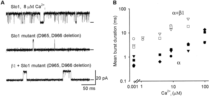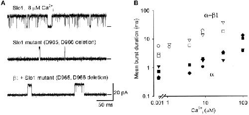 Figure 7. . The β1 subunit greatly increases burst duration and Po after a Ca2+ bowl mutation that deletes D965 and D966 of Slo1. (A) Representative single-channel currents recorded from Slo1 channels, and Slo1 channels with the Ca2+ bowl mutation that deletes D965 and D966 without and with β1 subunits. 8 μM Ca2+i, 50 mV. (B) Plots of mean burst duration versus Ca2+i for three mutant channels and four mutant channels with the β1 subunit.