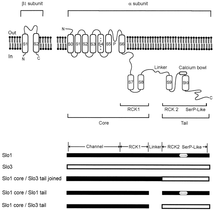 Figure 1. . Schematic diagram of the membrane topology of the β1 and α subunit of the BK (Slo1) channel is shown in the top panel. The core and tail region of the α subunit are indicated as well as the RCK1, RCK2, and serine proteinase (SerP) like domains. The unconserved linker between S8 and S9 connects the core and tail as well as the two RCK domains. The tail contains the Ca2+ bowl with five consecutive aspartic acid residues, implicated with high affinity Ca2+ binding. Schematic diagrams of the channels examined in this study are indicated below the topology diagrams. Note that the linker region between the S8-S9 is missing in the Slo1 core/Slo3 tail channel, and is present in the Slo1 core/Slo3 tail joined channel.