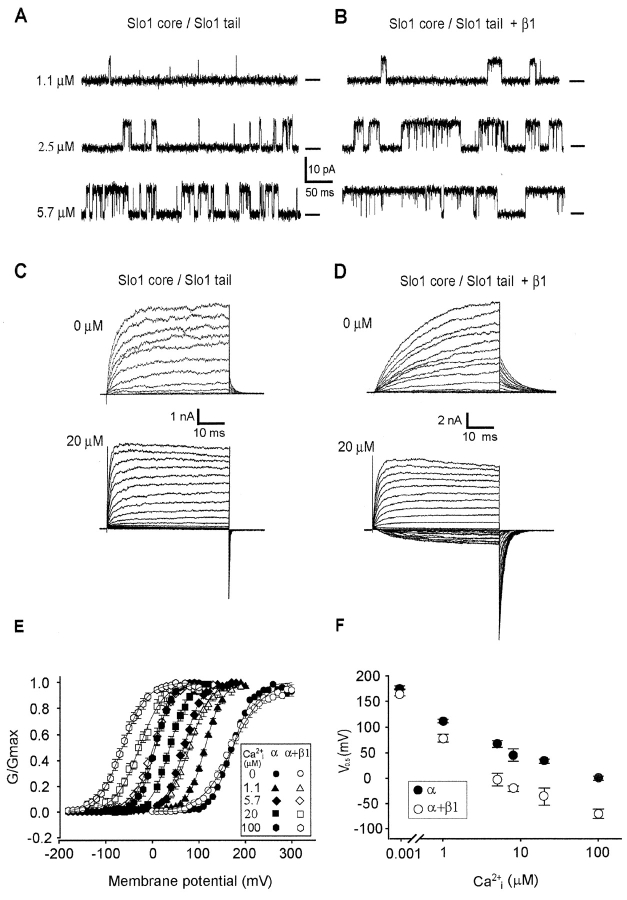 Figure 2. . The β1 subunit increases the apparent Ca2+ sensitivity of the Slo1core/Slo1 tail channels while reducing the voltage sensitivity. (A and B) Representative single-channel current traces recorded from Slo1 core/Slo1 tail channels with and without β1 subunits for 1.1, 2.5, 5.7 μM Ca2+i, as indicated, at 30 mV. (C and D) Representative macrocurrents recorded for 0 and 20 μM Ca2+i with and without the β1 subunit. For currents with 0 Ca2+i, the potential was held at −80 mV, stepped to potentials between 0 and 300 mV in increments of 20 mV, and then stepped to 40 mV to measure tail currents. For currents with 20 μM Ca2+i, the potential was held at −120 mV, stepped to potentials between −100 to 120 mV in increments of 10 mV and then stepped to −80 mV to measure tail currents. (E) G-V curves derived from tail currents of Slo1core/Slo1 tail channels with and without β1 subunits. Each point plots the mean from >5 different patches. The lines in the GV plots in this and later figures are the fitted Boltzmann function with Eq. 1. The average voltage sensitivity was 20.2 ± 1.0 mV/e-fold without the β1 subunit and 26.3 ± 2.1 mV/e-fold with the β1 (F) Plots of the V0.5 versus Ca2+i for experiments like in (E). V0.5 was determined separately for data from each of >5 different patches and then averaged.