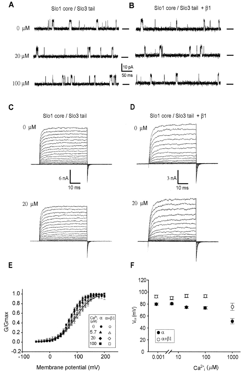 Figure 3. . The β1 subunit had little effect on burst duration and Po of Slo1 core/Slo3 tail channels at 30 mV, while decreasing the voltage sensitivity. (A and B) Representative single-channel currents recorded from Slo1core/Slo3 tail channels with and without β1 subunits, for 0, 20, and 100 μM Ca2+i at 30 mV. (C and D) Representative macrocurrents recorded with and without β1 subunits, for either 0 or 20 μM Ca2+i. Currents were held at −100 mV and then activated by stepping to potentials between −50 to 200 mV in increments of 10 mV, with tail currents measured at −80 mV. (E) G-V curves derived from tail currents of Slo1core/Slo3 tail channels with and without β1 subunits. The average voltage sensitivity was 22.6 ± 0.4 mV/e-fold without β1 subunits and 28.8 ± 0.5 mV/e-fold with β1 subunits. (F) Plots of V0.5 for Slo1 core/Slo3 tail channels with and without β1 subunits.