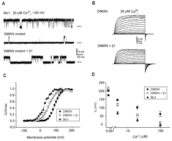 Figure 6. . The β1 subunit greatly increases burst duration and Po, and leftward shifts V0.5 after the Ca2+ bowl mutation D965N to the Slo1 channel. (A) Representative single-channel currents recorded from Slo1 channels, and Slo1 channels with the Ca2+ bowl mutation D965N without, and with β1 subunits. 20 μM Ca2+i, 30 mV. (B) Representative macrocurrents recorded from the D965N mutant Slo1 channels with and without β1 subunits. The potential was held at −120 mV, stepped to potentials between −100 to 200 mV in increments of 10 mV, and then stepped to −80 mV to measure tail currents. (C) G-V curves derived from tail currents of Slo1 channels, D965N mutant Slo1 channels, and D965N mutant Slo1 channels with β1 subunits (20 μM Ca2+i). The average voltage sensitivity was 19.1 ± 0.6 mV/e-fold without the β1 subunit and 23.1 ± 1.2 mV/e-fold with the β1 (n = 5 patches in each case except 3 patches for Slo1). (D) Plots of V0.5 for Slo1 channels, and D965N mutant Slo1 channels without and with β1 subunits.