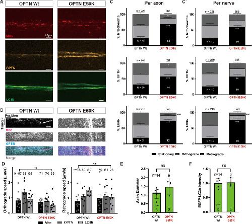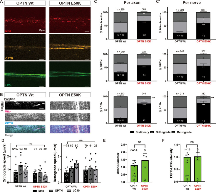 Figure 4—figure supplement 1. Movements of axonal mitochondria, OPTN, and LC3b within the sparsely labeled Mitotracker-labeled Tg(Isl2b:mCherry-OPTN(Wt or E50K)_ EGFP-LC3b) axons of retinal ganglion cells (RGCs) transplanted into non-transgenic X. laevis.Representative confocal images (A) and corresponding kymographs (B) of axonal mitochondria and OPTN within the sparsely labeled axons. Scale bar, 10 µm. Relative to Wt OPTN, E50K OPTN increases the percentage of stationary mitochondria, OPTN, and LC3b measured in sparsely labeled axons (analyzed per axon (C) and per animal (C’)). Mean ± SEM; n = 228–383 mitochondria in 48–52 axons from 10 animals. n = 249–331 OPTN in 44–66 axons from 10 animals. n = 213–340 LC3b in 42–51 axons from 10 animals. (D) Average speed of axonal mitochondria, OPTN, and LC3b in each direction (anterograde and retrograde) in Wt and E50K OPTN transgenic animals. Mean ± SEM; n = 71–97 mitochondria in 48–52 axons from 10 animals. n = 61–93 OPTN in 44–66 axons from 10 animals. n = 28–95 LC3b in 42–51 axons from 10 animals. (E) Width measurement of axons based on the EGFP-LC3b signal after expression of Wt or E50K OPTN. Mean ± SD; n = 14 axons from 5 animals for Wt OPTN, and n = 6 axons from 3 animals for E50K OPTN. (F) Peak EGFP-LC3b signal per axon after expression of Wt or E50K OPTN, normalized relative to mean value of Wt OPTN group. Mean ± SD; n = 14 axons from 5 animals for Wt OPTN, and n = 6 axons from 3 animals for E50K OPTN. Statistical analyses in (C) and (D) were performed by two-way ANOVA following Tukey’s post hoc test for multiple comparisons, and in (E) and (F) by unpaired, two-tailed Student’s t-test. Not significant (ns); *p < 0.05, **p < 0.01, ***p < 0.001.