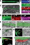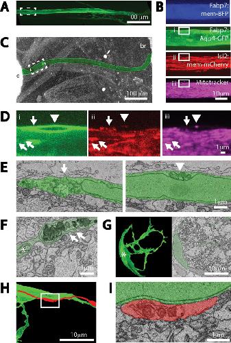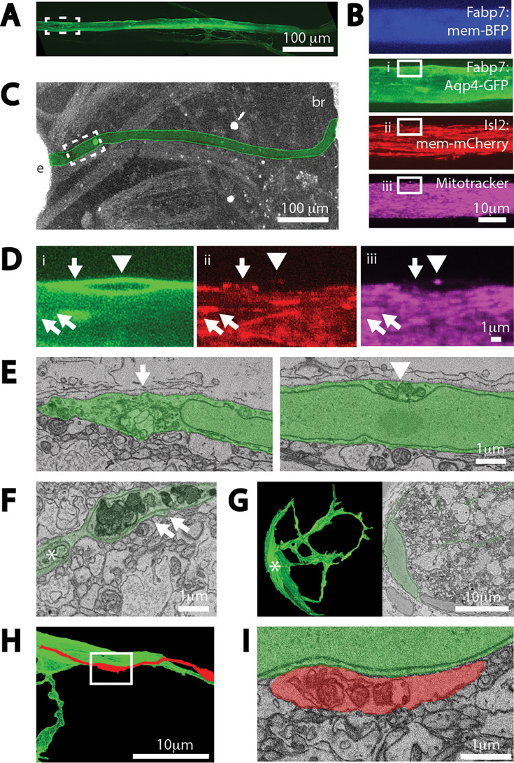 Figure 5. Extruded axonal mitochondria are degraded by astrocytes.(A) Z-projection of full length of the optic nerve visible through live imaging, labeled by an Aqp4-GFP transgene expressed in astrocytes. (B) Z-projections of four channels after higher resolution imaging of a region of the same optic nerve, position shown in stippled boxed region in (A); four channels are astrocyte expressed mem-BFP and Aqp4-GFP transgenes, a retinal ganglion cell (RGC) expressed mem-mCherry transgene, together with intravitreally injected Mitotracker. Solid boxes represent fields shown at higher resolution in (D) and (E). (C) Micro-CT of the head of the same animal after embedding in epoxy resin, used to pin-point the area live-imaged for subsequent SBEM analyses. Optic nerve is colorized green. Letter insets: e is eye and br is brain. (D) Superficial astrocyte soma labeled by astrocyte expressed Aqp4-GFP transgene (i) containing axonal derived membranes (ii) and mitochondria (iii). Arrow, arrowhead, and double arrows represent three discrete axonal mitochondria signal unambiguously identifiable at both light level live imaging and at the level of SBEM, shown in (E) and (F). (E) Two SBEM sections of the same astrocyte soma centered on discrete pockets phagocytosed axonal membranes and mitochondrial material. (F) Extra-axonal mitochondria and membranes within fine astrocyte processes. Asterisk represents a process originating from the same astrocyte shown in (G). (G) Morphology of one of the astrocytes whose processes are near the extra-axonal mitochondria shown in (F); on right, reconstruction of about half the astrocyte and on left single plane. (H) Reconstruction of an axon near the soma of the same astrocyte shown in (D) and (E). (I) Dystrophic mitochondria within axon appearing to be enwrapped in other axonal membranes within the axon, adjacent to superficial astrocyte soma.