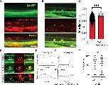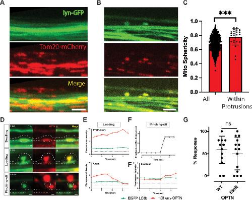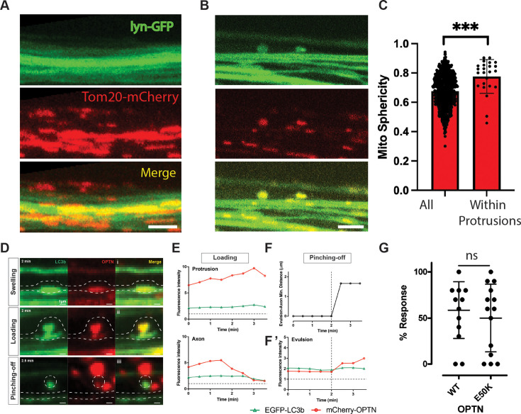 Figure 6. Mitochondria and OPTN leave retinal ganglion cell (RGC) axons through focal dystrophies.(A) Tom20-mCherry-labeled RGC mitochondria from sparse axons are found outside the axons, as labeled by a membrane EGFP transgene. Image is a z-projection spanning 4 µm, as external mitochondria have a diffuse pattern. (B) Axolemmal protrusions in sparse axons containing mitochondria. Image represents a single z plane. (C) Sphericity measures show that mitochondria within axolemmal protrusions differ from other axonal mitochondria. (D) Examples of axonal dystrophies in sparsely labeled Tg(Isl2b:mCherry-OPTN(M98K)_ EGFP-LC3b) axons containing partially co-localized stopped OPTN and LC3b; presented as a pseudo-sequence consistent with extra-axonal OPTN being the product of transcellular mitochondrial degradation. (i) Swelling, where the mitophagy machinery OPTN and LC3b is stopped together and focally enriched in a symmetric axonal dystrophy. (ii) Loading, where focally accumulated OPTN is enriched in an asymmetric axonal dystrophy. (iii) Pinching-off, where an axon evulsion is acutely separated from the axon of origin and appears to coalesce with other extra-axonal OPTN presumably within acidified organelles of a phagocyte. Scale bar, 1 µm. (E) Changes in fluorescence within the axon protrusion and directly beneath it within the axon of origin suggest an active loading process. (F) Minimum distance and (F’) changes in fluorescence within the axon evulsion show further increase in OPTN soon after separation from the axon. Gray dotted horizontal lines represent the mean fluorescence in the same axon away from the axon dystrophy, set at 1; thus, all fluorescence values shown represent focal concentrations of both LC3b and OPTN signal, suggestive of these being sites of axonal mitophagy. (G) Dot-avoidance response of animals expressing OPTN Wt or E50K transgenes. Not significant (ns); ***p < 0.0001 .