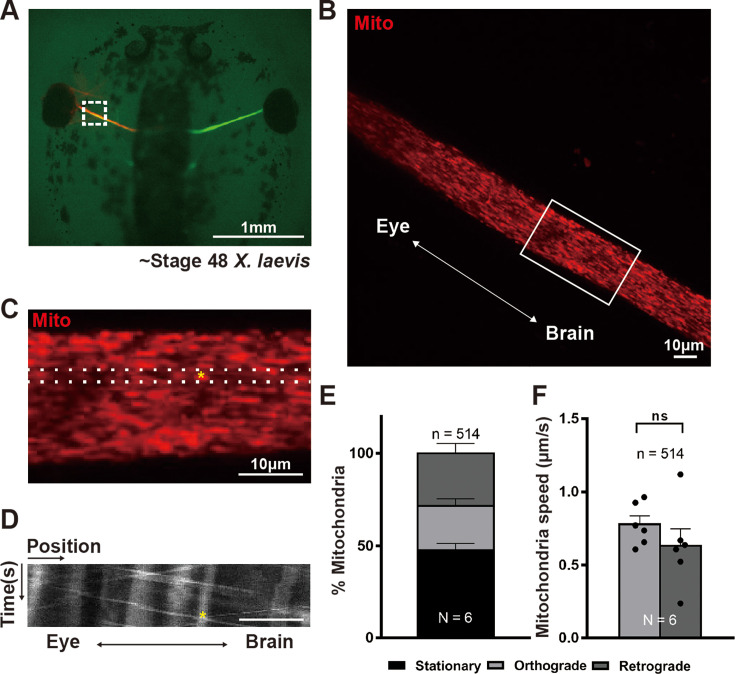 Figure 1. Live-imaging mitochondria movement within X. laevis tadpole optic nerve shows that in retinal ganglion cell (RGC) axons approximately half of mitochondria are stopped and there is balanced anterograde and retrograde movement.(A) Intravitreal injection of Mitotracker Deep Red can be used to label RGC mitochondria within axons; here in Tg(Isl2b:GFP) transgenic tadpoles where the RGC axons are also labeled by a cytoplasmic GFP expressed by the Isl2b RGC-specific promoter. The white dotted box illustrates the approximate location of spinning-disc confocal live imaging (1 min, 1 Hz). Representative single frame of a Mitotracker Deep Red labeled optic nerve full region imaged in (B); boxed area rotated and enlarged in (C). (D) Representative kymograph displaying the position (x-axis) of mitochondria over time (y-axis, 60 s); derived from the region between the dotted lines in C for all 60 frames. The yellow star indicates the position of the same mitochondrion in both kymograph (D) and representative image (C). Scale bar, 10 µm. Quantification of mitochondrial movements, showing that (E) about half of RGC axonal mitochondria are stationary and there are comparable numbers of mitochondria moving anterogradely and retrogradely, and (F) the average speed of anterograde and retrograde mitochondria movement is similar. Mean ± SEM; n = 514 mitochondria from 6 animals. Statistical analysis in (F) was performed by unpaired, two-tailed Student’s t-test. Not significant (ns).