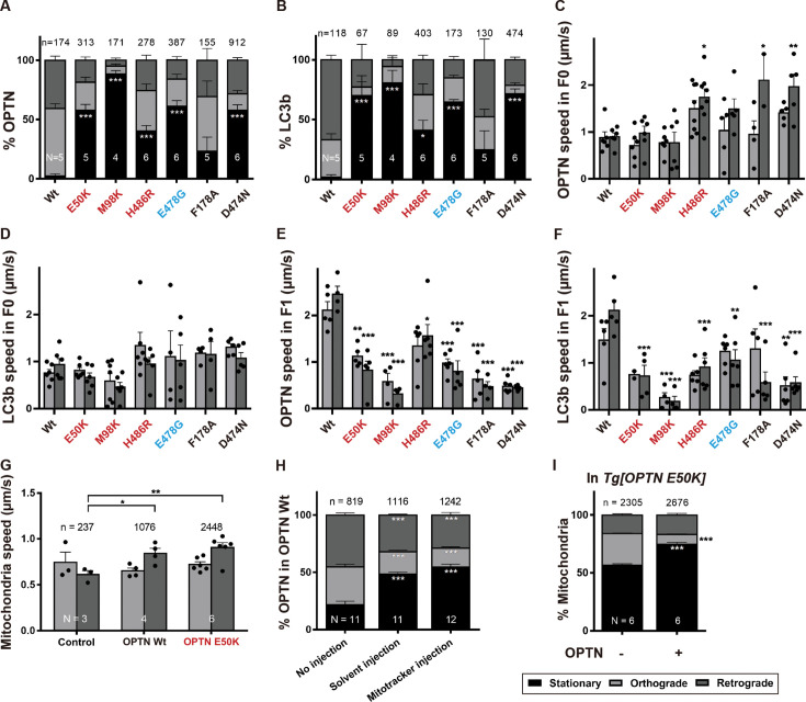 Figure 2—figure supplement 1. Movement of OPTN and LC3b in F1 animals (not injected intravitreally with Mitotracker) matches those observed in F0 animals, including showing no large velocity changes in either anterograde or retrograde movement.Percentage of each movement (stationary, anterograde, and retrograde) of OPTN (A) and LC3b (B) in F1 transgenic animals and (C–F) average speed of axonal OPTN and LC3b in each direction (anterograde and retrograde) in F0 (C, D) and F1 (E, F) transgenic animals. Mean ± SEM; n = 155–912 OPTN from 4 to 6 animals. n = 67–474 LC3b from 4 to 6 animals. (G) Average anterograde and retrograde speed in control (non-transgenic, only Mitotracker-injected animals), and Wt OPTN and E50K OPTN expressing retinal ganglion cell (RGC) axons. Mean ± SEM; n = 237–2448 mitochondria from 3 to 6 animals. (H) Fraction of stopped and moving OPTN in animals expressing Wt OPTN in the presence and absence of intravitreal injections (0.5X MMR solvent or Mitotracker injections). Mean ± SEM; n = 819–1242 OPTN objects measured in 11–12 animals. (I) Quantification of mito-OPTN co-localizations in Mitotracker-injected E50K OPTN animals. Percentage of each movement (stationary, anterograde, and retrograde) of mitochondria co-localizing with (mito-OPTN) or not co-localizing with (mito-ONLY) OPTN in E50K OPTN expressing animals. Mean ± SEM; n = 2305 mito-ONLY, n = 2676 mito-OPTN co-localizations from 6 E50K OPTN animals. Statistical analysis in (A–I) was performed by two-way ANOVA following Tukey’s post hoc test for multiple comparisons. *p < 0.05, **p < 0.01, ***p < 0.001 after 24 hr treatment with chloroquine. Mean ± SD; n = 11–12 animals.