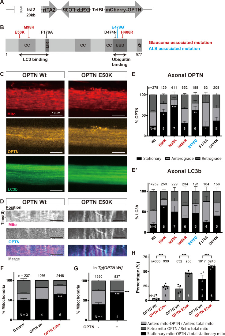 Figure 2. OPTN mutants conditionally expressed in retinal ganglion cells (RGCs) increase the fraction of stopped axonal mitochondria, OPTN and LC3b, and the fraction of mitochondria co-localizing with OPTN.(A) Illustration of the transgenic construct: Isl2b promoter driving rtTA2 linked to EGFP-LC3b and mCherry-OPTN driven in opposite strands by a bidirectional tetracycline operator, TetBI. The fusion constructs are thus expressed only in RGCs and only after doxycycline induction. (B) Schematic of OPTN functional domains showing the position of the point mutations examined. Three glaucoma-associated mutations, E50K, M98K, and H486R; an ALS-associated mutation, E478G; two synthetic OPTN mutations, F178A and D474N, disrupting LC3b and ubiquitin binding, respectively. CC: coiled coil domain, LIR: LC3 interacting region, UBD: ubiquitin-binding domain, ZF: zinc finger. Numbers indicate the amino acid position. Representative confocal images (C) and corresponding kymographs (D) of axonal mitochondria, OPTN, and LC3b in Mitotracker-injected Tg(Isl2b:mCherry-OPTN(Wt or E50K)_ EGFP-LC3b) animals 3 days after induction of transgene expression. Scale bar, 10 µm. Quantification of OPTN (E) and LC3b (E’) movements in Wt OPTN and various OPTN mutants (all independent F0 animals). Bar graphs show the percentage of each movement (stationary, anterograde, and retrograde) of OPTN and LC3b in Wt OPTN and OPTN mutants. Mean ± SEM; n = 63–652 OPTN and n = 156–259 LC3b objects measured in 4–8 animals. (F) Quantification of mitochondrial movements after Mitotracker injection in control (non-transgenic), and transgenic animals expressing in RGCs either Wt or E50K OPTN (analyzed in F1 animals). Expression of E50K OPTN but not Wt OPTN results in a significant increase in stalled mitochondria compared to the control. Mean ± SEM; n = 237–2448 mitochondria from 3 to 6 animals. Quantification of mito-OPTN co-localization in Mitotracker-injected Wt OPTN (G, H) and E50K OPTN (H) animals. (G) Percentage of each movement (stationary, anterograde, and retrograde) of mitochondria co-localizing (mito-OPTN) or not co-localizing (mito-ONLY) with OPTN in the animals expressing Wt OPTN. Mean ± SEM; n = 1550 mito-ONLY, n = 537 mito-OPTN co-localizations from 4 Wt OPTN animals. (H) Expression of E50K OPTN results in increased fraction of mito-OPTN (mitochondria-OPTN co-localization) relative to Wt OPTN, both in the moving and stationary pools. Mean ± SEM; n = 658–930 total anterograde mitochondria, n = 632–938 total retrograde mitochondria, n = 1017–3246 total stationary mitochondria from 4 to 6 animals. Statistical analysis in (E–H) was performed by two-way ANOVA following Tukey’s post hoc test for multiple comparisons. *p < 0.05, **p < 0.01, ***p < 0.001.