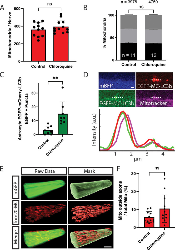 Figure 3—figure supplement 1. Inhibiting autophagolysosome formation through chloroquine minimally affects retinal ganglion cell (RGC) axonal mitochondria degradation.(A) Quantification of Tom20-mCherry puncta number per axon segment imaged in the presence or absence of chloroquine for 24 hr. Mean ± SD. (B) Quantification of Tom20-mCherry movements showing the percentage of each movement (stationary, anterograde, and retrograde; black, light gray, and dark gray, respectively) in the presence or absence of chloroquine for 24 hr. N and n represent the number of animals and mitochondria analyzed. (C) EGFP+ autophagosome puncta increase in astrocytes expressing EGFP-mCherry-LC3b reporter in response to 10 hr of chloroquine treatment. (D) In the presence of chloroquine, some EGFP+ autophagosome puncta contain RGC mitochondria. (E) 3D reconstructions of raw fluorescence and Imaris-generated masks used for quantifications for RGC expressed membrane-GFP (mGFP) and mitochondria (Tom20-mCherry) transgenes. D: dorsal, V: ventral, C: caudal, R: rostral. Scale bar, 10 µm. (F) Percentage of RGC Tom20-mCherry signal outside of lynkGFP-labeled RGC axons is not significantly affected by chloroquine treatment.