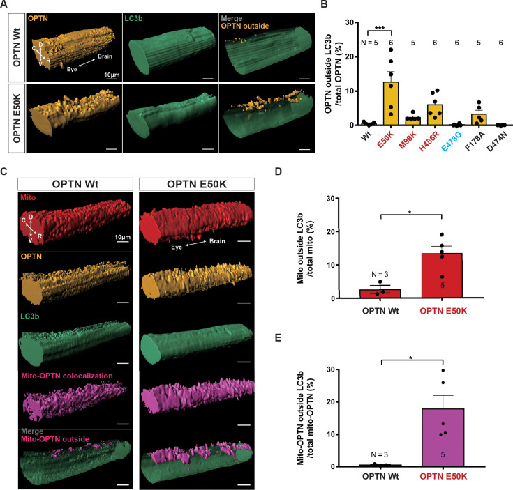 Figure 3. 3D reconstruction of axonal mitochondria, OPTN and LC3b in optic nerves shows that glaucoma-associated OPTN mutations increase the amounts of mitochondria, OPTN, and mito-OPTN outside of the LC3b-labeled axons.(A) Reconstruction of optic nerves displaying OPTN, LC3b, and OPTN outside LC3b-labeled retinal ganglion cell (RGC) axons (merged images on the right) in the optic nerves of animals expressing Wt and E50K OPTN. D: dorsal, V: ventral, C: caudal, R: rostral. Scale bar, 10 µm. (B) Percentage of OPTN outside LC3b-labeled RGC axons is significantly higher or trends so in the glaucoma-associated OPTN mutations. Mean ± SEM; n = 5–6 animals. (C–E) 3D reconstruction of axonal mitochondria, OPTN, and LC3b within the segments of intraocular optic nerves in Mitotracker-injected Tg(Isl2b:mCherry-OPTN(Wt or E50K)_ EGFP-LC3b) X. laevis. (C) Reconstruction displaying mitochondria, OPTN, LC3b, mito-OPTN co-localization, and mito-OPTN outside LC3b-labeled RGC axons (merged images on the bottom) in the optic nerves of animals expressing Wt and E50K OPTN. D: dorsal, V: ventral, C: caudal, R: rostral. Scale bar, 10 µm. Percentage of mitochondria (D) and mito-OPTN (E) outside of LC3b-labeled RGC axons after expression of Wt and E50K OPTN. Expression of E50K OPTN results in a significant increase in mitochondria and mito-OPTN co-localizations outside of LC3b-labeled RGC axons. Mean ± SEM; n = 3–5 animals. Statistical analysis in (B) was performed by one-way ANOVA following Tukey’s post hoc test for multiple comparisons, and (D, E) was performed by unpaired, two-tailed Student’s t-test. *p < 0.05, ***p < 0.001.