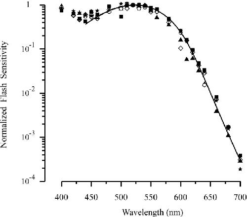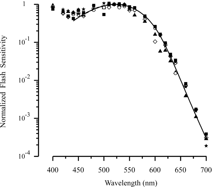 Figure 1. . Action spectra of Xenopus rods at different developmental stages. The normalized dim-flash sensitivity was calculated from r/IF (see text), and the sensitivity at 520 nm was then arbitrarily renormalized to unity. Data from one rod at each stage. Symbols: ○, stage 48; ▴, stage 50; ⋄, stage 55; ▪, stage 62; ★, frog at size of 2.5–5cm. Curve is drawn from Eq. 4.