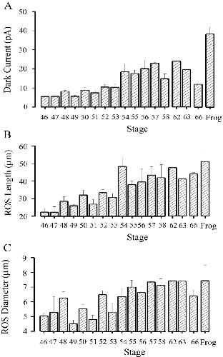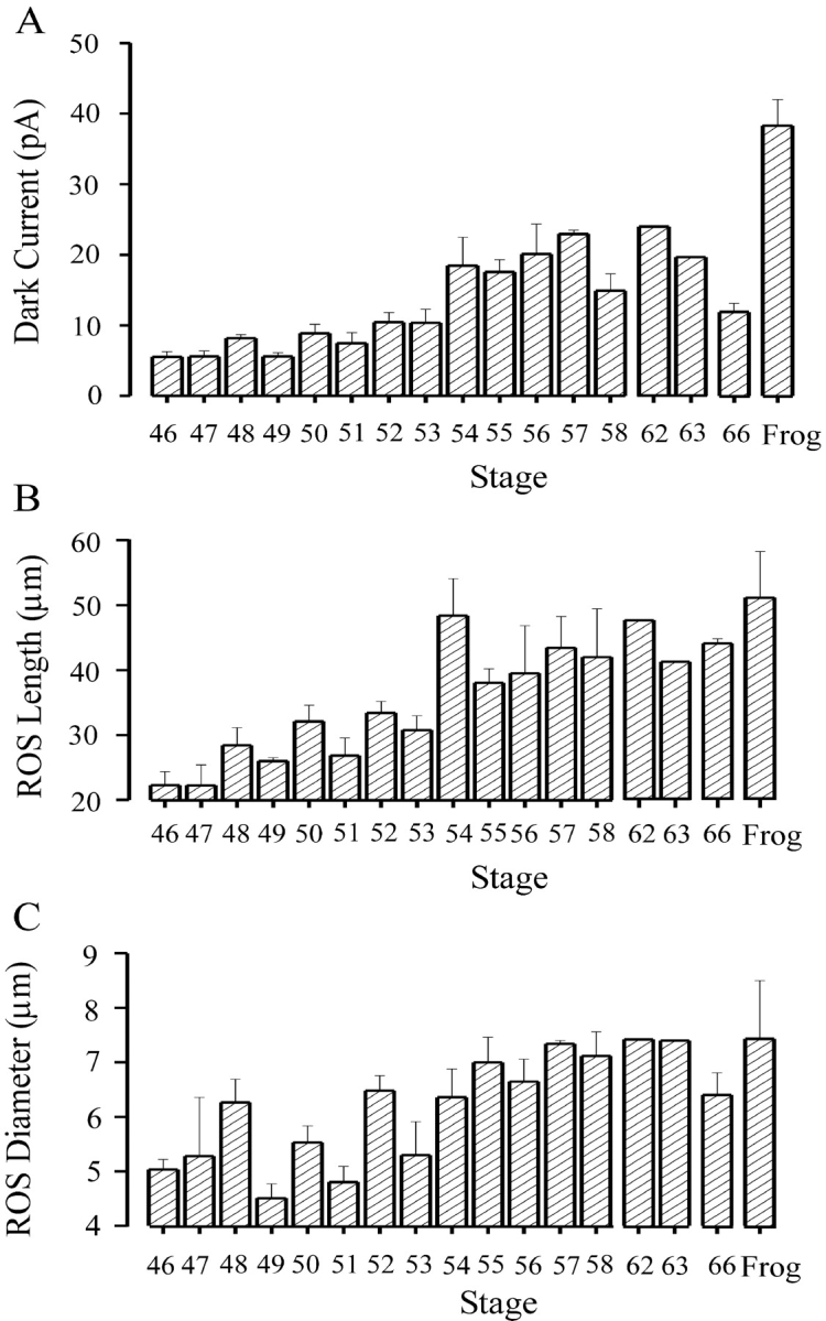 Figure 2. . Dark currents and physical dimensions of recorded rod outer segments (ROS) at different developmental stages. Results from tadpoles at stages 46–66 and frogs at sizes of 2.5–5cm. The histograms indicate averaged data and SEM. The number of rods studied at each stage were: 6(stage 46), 2(47), 5(48), 2(49), 10(50), 5(51), 9(52), 3(53), 4(54), 10(55), 5(56), 3(57), 4(58), 1(62), 1(63), 5(66) and 2(frog), respectively.