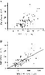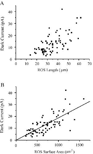 Figure 3. . Variation of dark current with rod outer segment length and surface area. Altogether, 77 cells from stage 46–66 tadpoles and young adult frogs. Solid line in B is a linear-regression line, with a slope of 0.0188 pA/μm2.