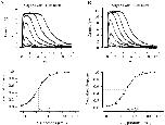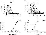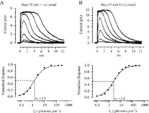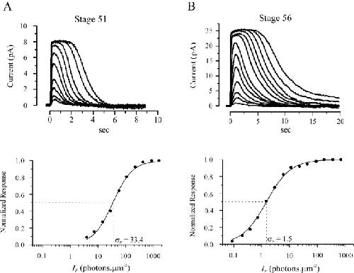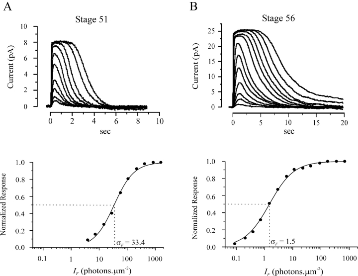 Figure 4. . Rod response properties at stages 51 and 56. In each case, top panel indicates flash response-intensity family from an overnight-dark-adapted rod, and bottom panel shows the relation between peak amplitude and flash intensity of the same cell. (A) Flash intensities were 3.86, 7.18, 14.67, 27.95, 57.07, 106.3, 216.9, 413.4, 844.1, and 1571.7 photons.μm−2, respectively. Light flash was delivered at time 0. The solid curve is Eq. 1 with σF equal 33.4 photons.μm−2. (B) Flash intensities were 0.09, 0.20, 0.39, 0.72, 1.47, 2.93, 5.99, 11.2, 22.8, 43.4, 90.5, 172.0, 352.9, and 693.7 photons.μm−2, respectively. The solid curve is Eq. 1 with σF equal 1.5 photons.μm−2.