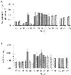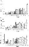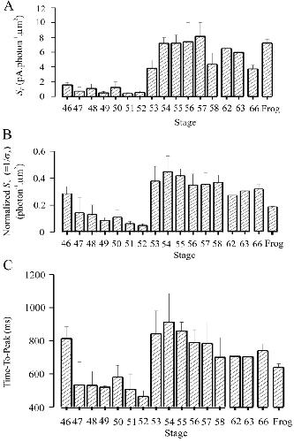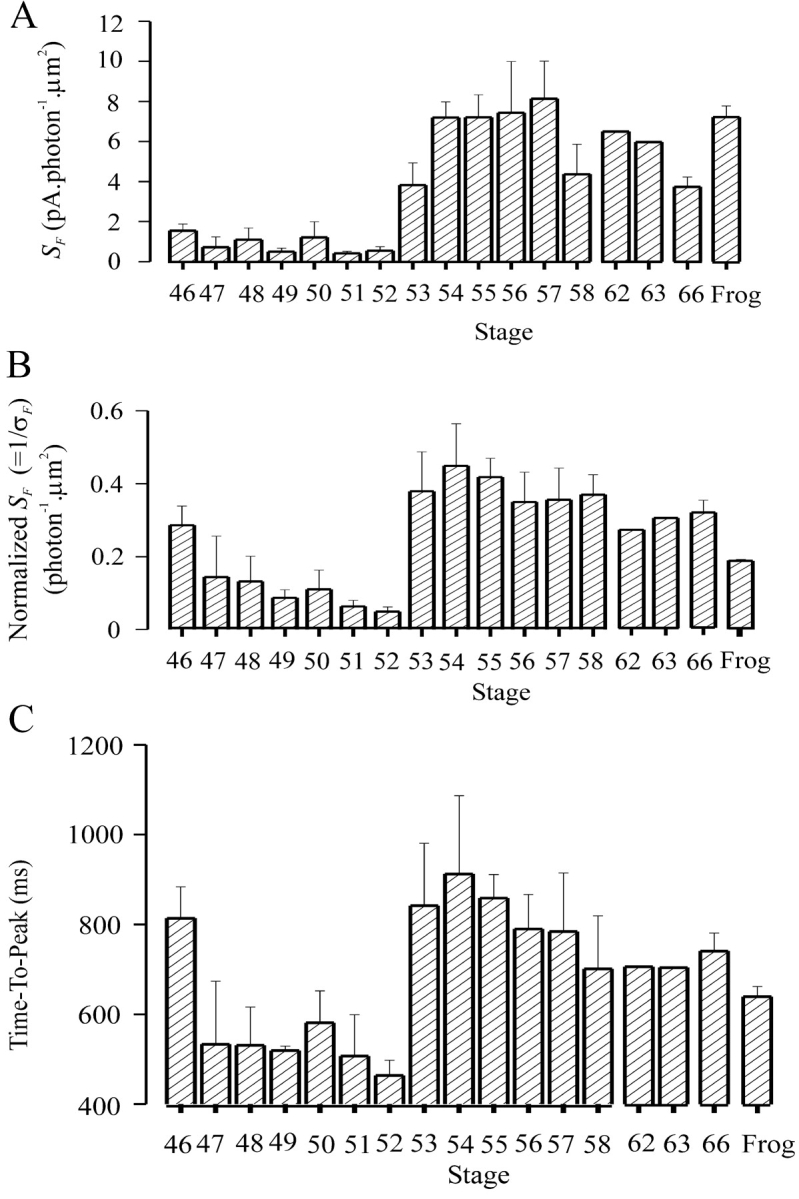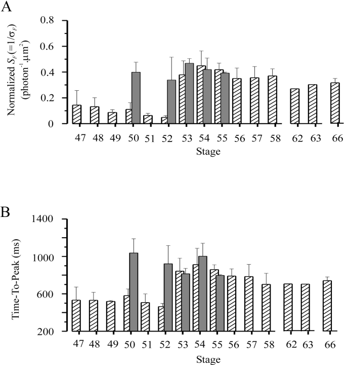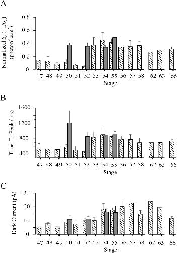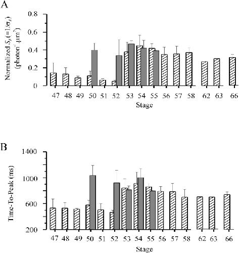 Figure 10. . Collected results on normalized flash sensitivity and time-to-peak of half-saturated flash response of rods after prolonged dark adaptation at various developmental stages. Dark bars indicate the collected results. The number of rods studied at each stage was: 3(stage 50), 2(stage 52), 3(stage 53), 5(stage 54) and 2(stage 55). Hatched bars are redrawn from Fig. 5, B and C.